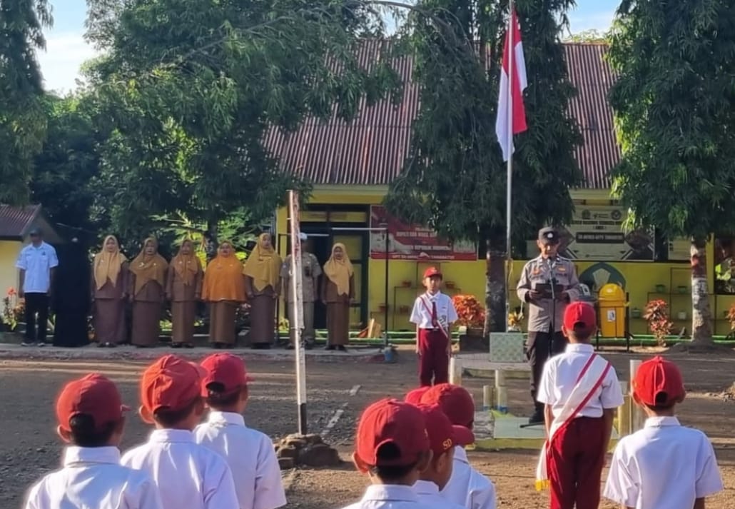 BONE – Libureng, Ka SPK Polsek Libureng Polres Bone Aiptu Arifuddin, S.Sos memimpin pelaksanaan upacara bendera di SD Inpres 6/75 Kel. Tanabatue Kec. Libureng Kab. Bone, (28 April 2025).