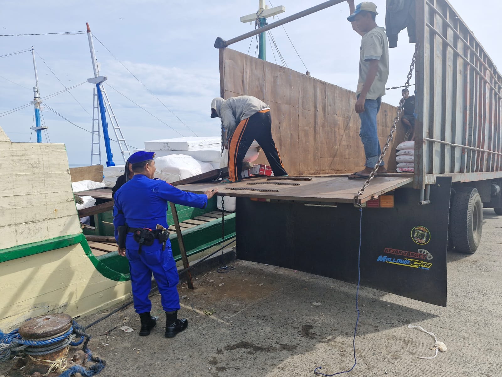 BONE – Bajoe, Kapal barang yang melakukan aktivitas pemuatan dan yang berlabu disepanjang dermaga pelabuhan rakyat Bajoe Kecamatan Tanete Riattang Timur Kabupaten Bone diperiksa oleh pihak Satpolairud Polres Bone.