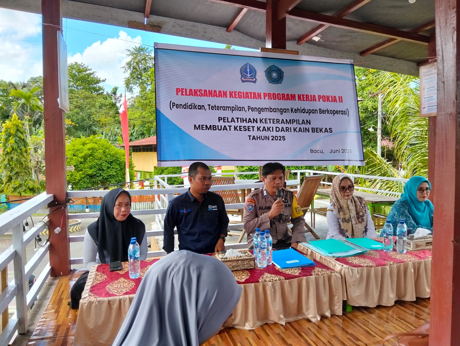 Bripka Samsu Alam dalam sambutannya menyampaikan apresiasi atas inisiatif desa yang terus berupaya membekali warganya dengan keterampilan produktif. “Kami dari pihak kepolisian sangat mendukung kegiatan positif seperti ini. Semoga melalui pelatihan ini, masyarakat bisa lebih mandiri dan kreatif, serta mampu menciptakan peluang usaha baru,” ujarnya.
