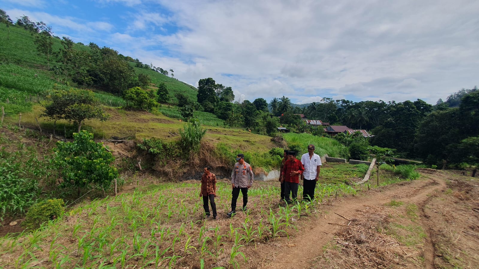 Dalam kunjungannya, Iptu Kamaluddin meninjau langsung kondisi tanaman jagung yang saat ini memasuki masa pertumbuhan. Ia juga berdialog dengan para petani setempat mengenai kendala yang dihadapi dalam proses budidaya serta distribusi hasil panen.