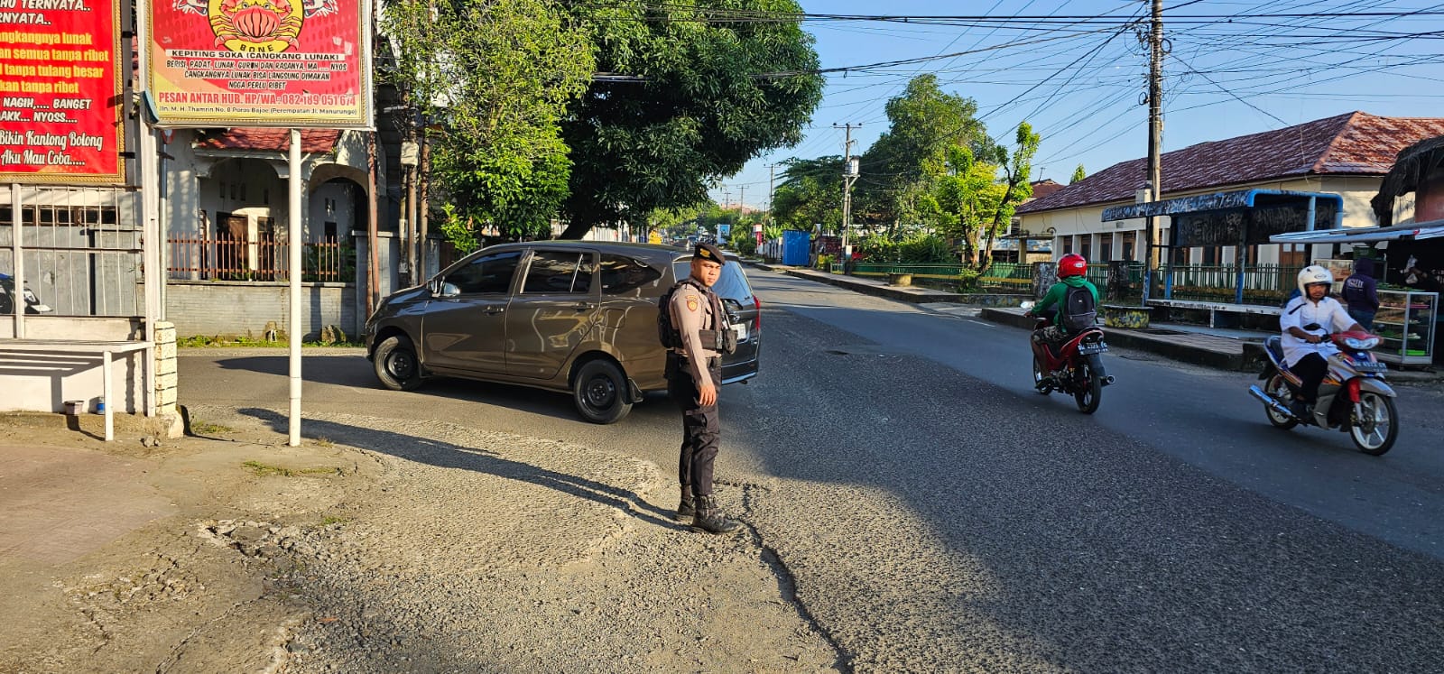 BONE -Personel Sat Samapta Polres Bone Polda Sulawesi Selatan laksanakan pengaturan pagi dan himbauan lalu lintas di Kota Watampone, Senin (21/07/2025).