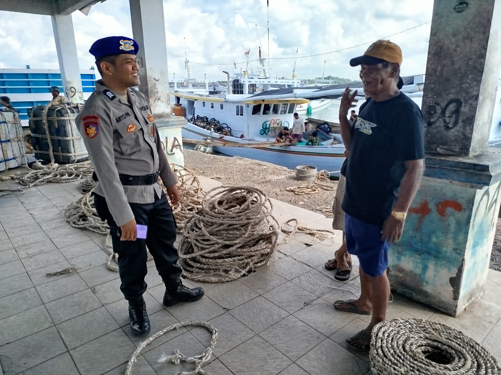 BONE – Bajoe, Personil Satpolairud Polres Bone melakukan pemantauan situasi keamanan dan ketertiban masyarakat (Kamtibmas) serta menyapa masyarakat nelayan yang sedang mempersiapkan perlengkapan untuk dibawa turun melaut, Selasa (29/07/2025) pagi.