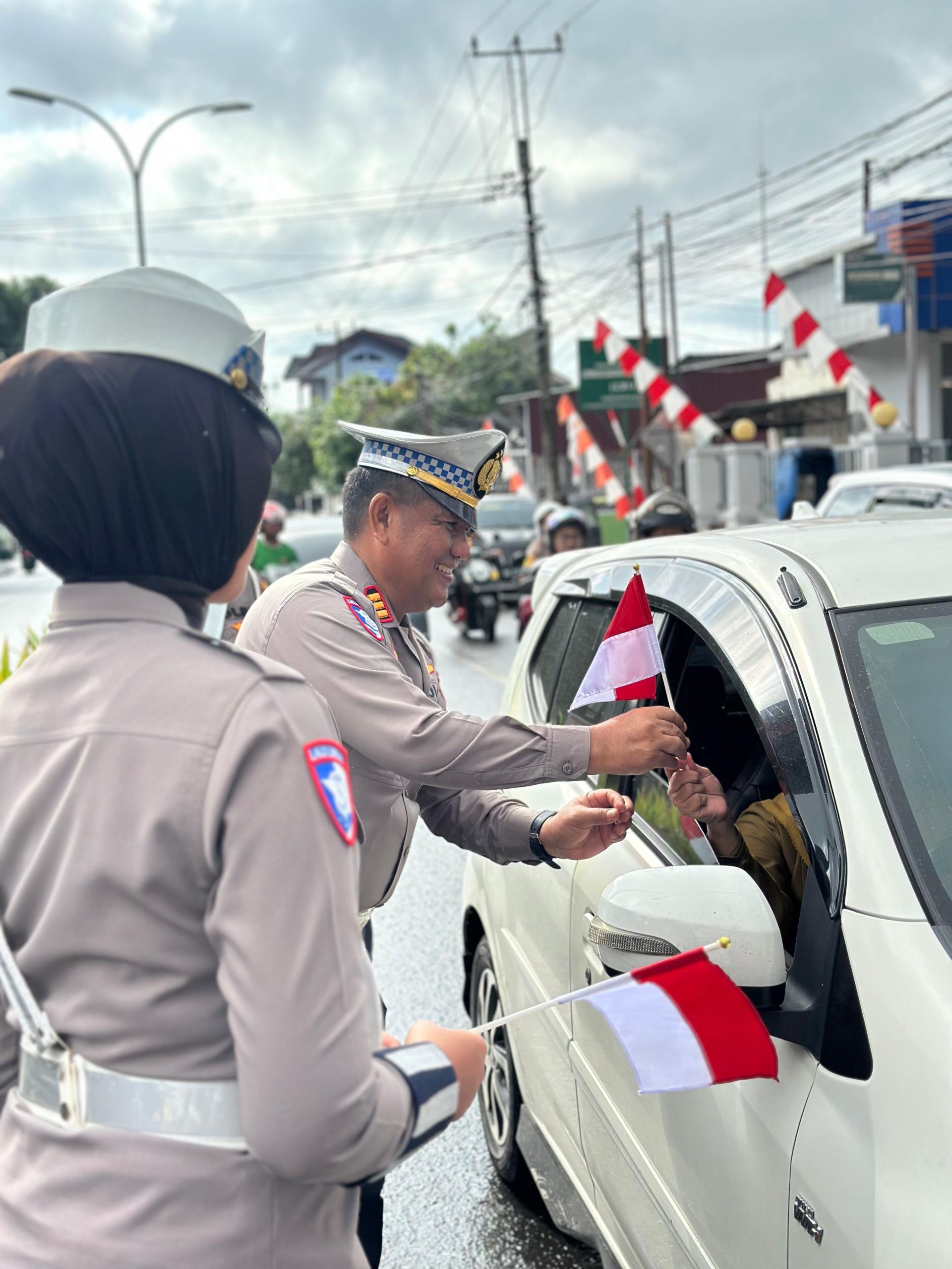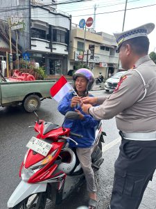 Dalam suasana yang penuh semangat kebangsaan, para petugas membagikan Bendera Merah Putih kepada pengendara sepeda motor, mobil, yang sedang melintas.