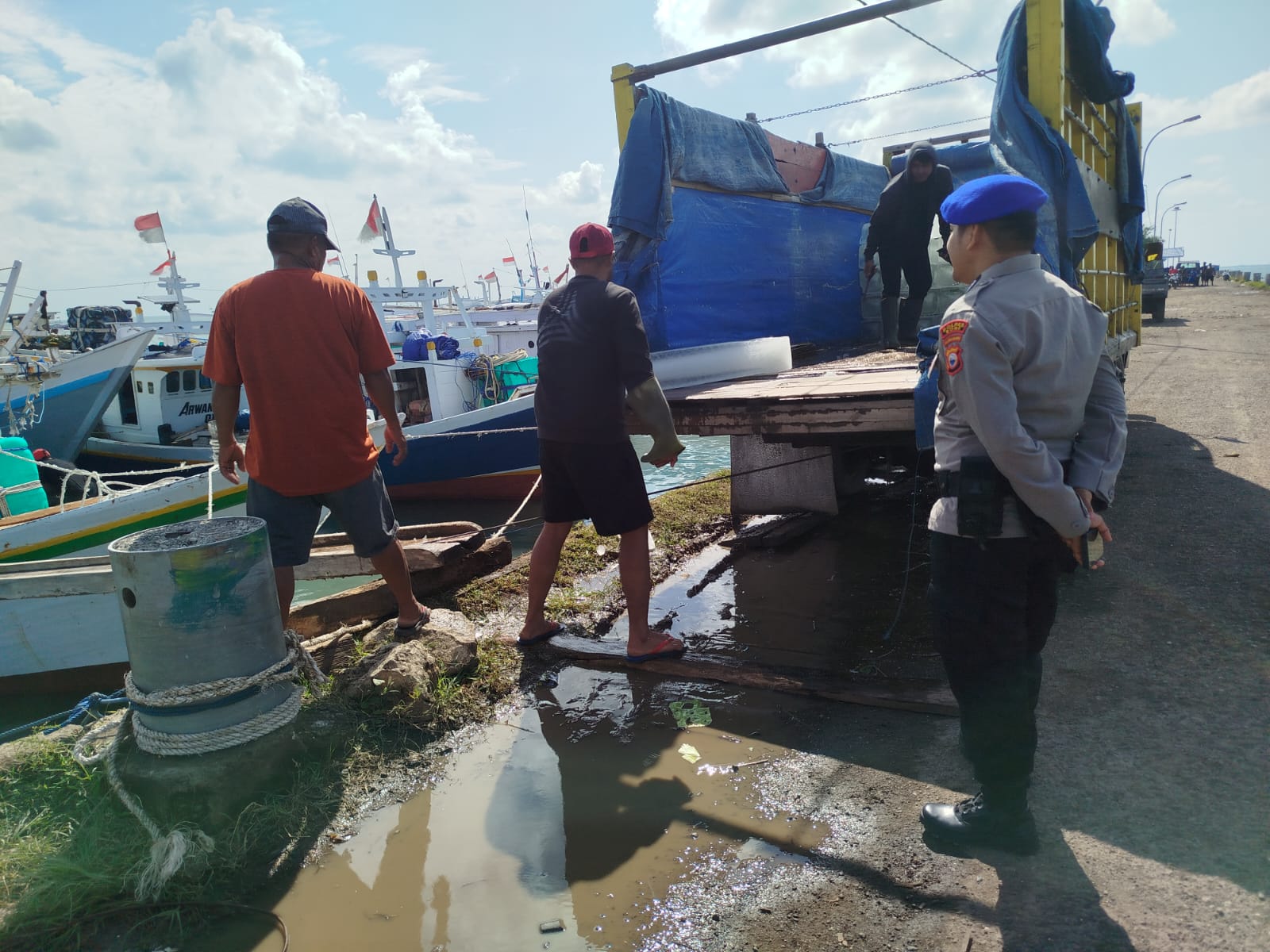 Dalam kegiatan Polmasnya, Brigpol Aryo bersama anggotanya memantau langsung aktivitas bongkar muat barang dari mobil ke kapal dan mengecek barang yang diangkut sekaligus memberikan himbauan kamtibmas kepada buruh pelabuhan.