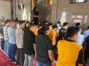 BONE – Jajaran Polres Bone menggelar Shalat Ghoib dan doa bersama atas gugurnya salah satu pengemudi ojek online, almarhum Affan Kurniawan, pada Jumat (29/8/2025) sekitar pukul 13.00 Wita. Kegiatan ini berlangsung di Masjid Qadrul Islam Polres Bone dan dipimpin oleh Imam Masjid, Ustadz Al Hafidz Nizar Darwis.