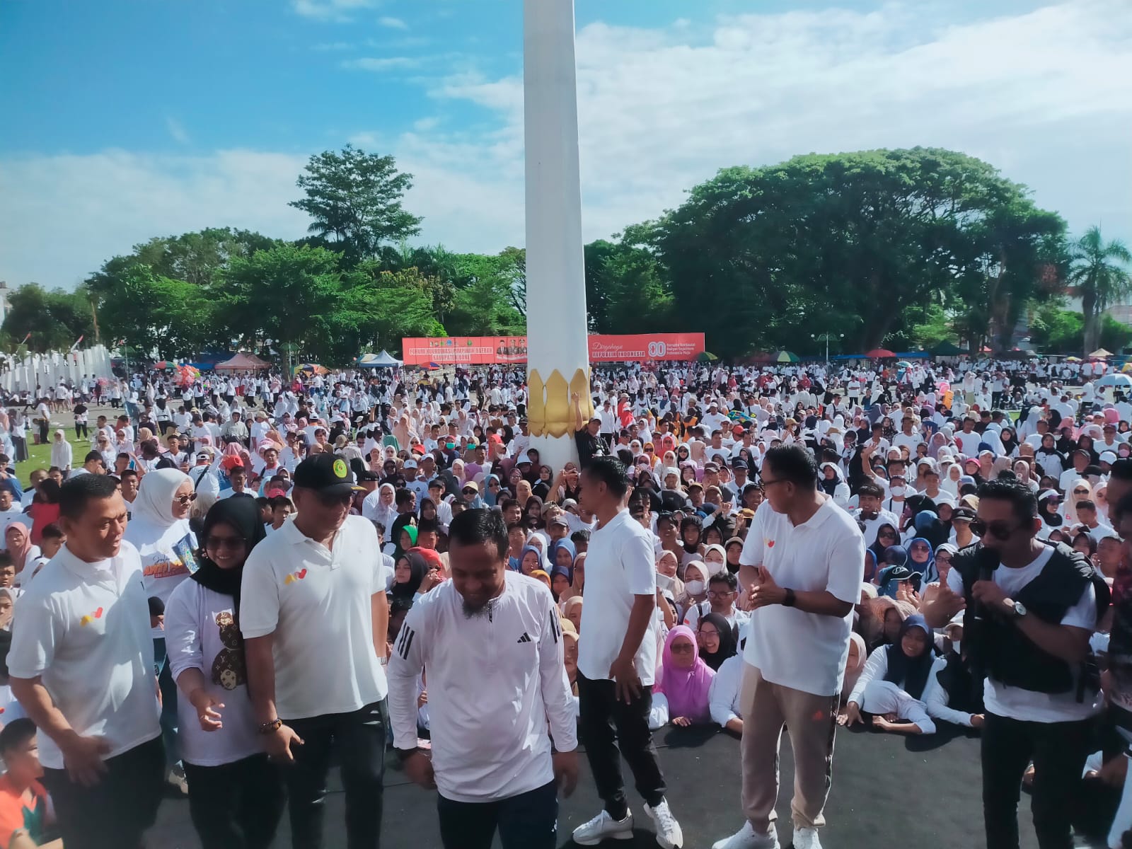 BONE – Manurunge, Antusiasme ribuan masyarakat Bone terlihat memadati Lapangan Merdeka Watampone, Jalan Petta Ponggawae, Kelurahan Manurungnge, Kecamatan Tanete Riattang, dalam kegiatan Jalan Sehat Anti Mager & Gerakan Pasar Murah yang digelar oleh Pemerintah Provinsi Sulawesi Selatan bekerja sama dengan Pemerintah Kabupaten Bone, Minggu (14/9/2025).