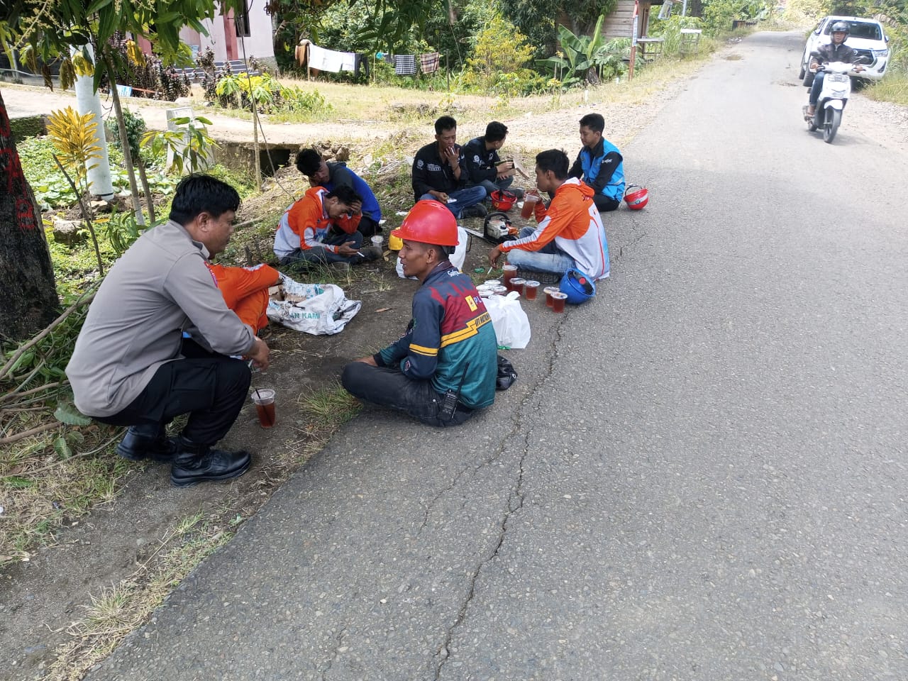 BONE – Apala Bhabinkamtibmas Polsek Barebbo Polres Bone, Bripka Samsu Alam, melakukan sambang kepada para pekerja dari pihak PLN yang tengah bertugas memangkas ranting pohon yang menghalangi kabel aliran listrik, Selasa (21/10/2025).