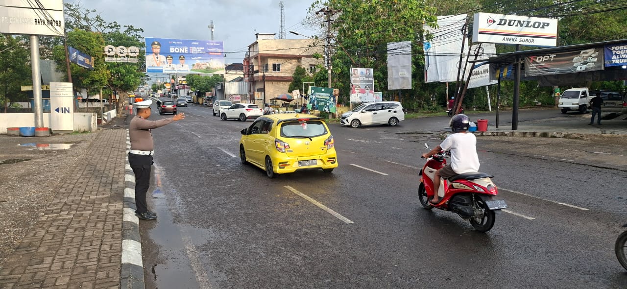 BONE – Guna menjaga kelancaran arus lalu lintas, dan mengantisipasi kemacetan serta kecelakaan lalu lintas, Personel Satlantas Polres Bone melaksanakan pelayanan prima sore hari terhadap Masyarakat, Minggu sore (2/11/2025).