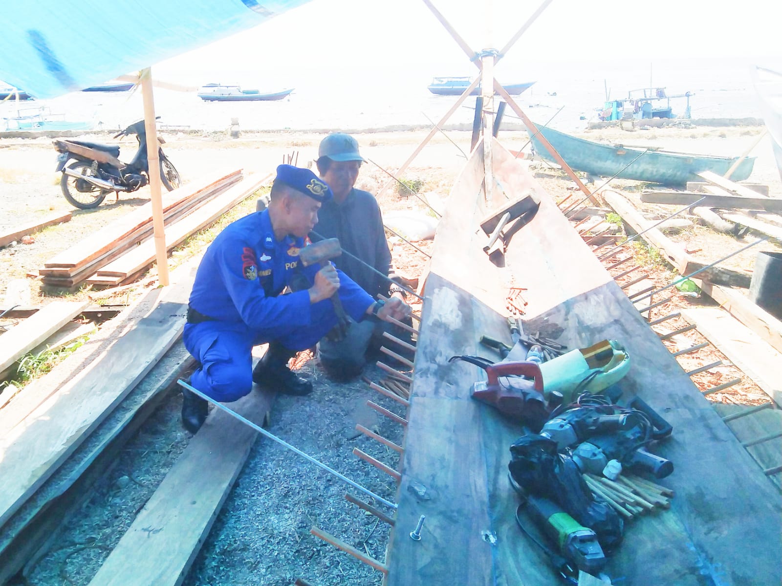 BONE – Bajoe, Personel Satpolairud Polres Bone Aipda Daniel melakukan kegiatan sambang ditempat pembuatan kapal nelayan tepatnya diwilayah pesisir Kelurahan Bajoe Kecamatan Tanete Riattang Timur Kabupaten Bone sekaligus memantau situasi keamanan wilayah pesisir, Kamis (06/11/2025) pagi.