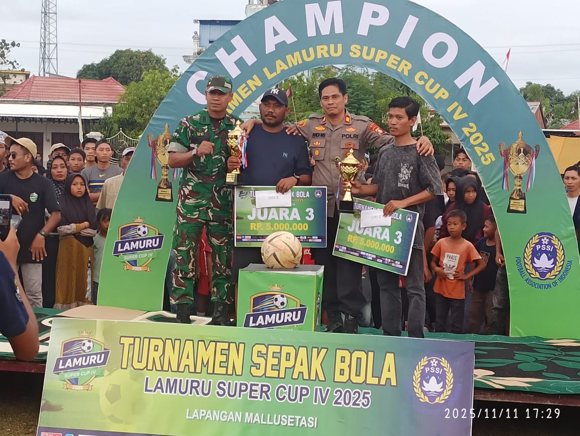 BONE – Tellu Siattinge, Kapolsek Tellu Siattinge Polres Bone AKP Andi Muhammad Siregar, S.H. menghadiri penutupan Turnamen Sepak Bola Lamuru Super Cup IV. Penutupan Turnamen Sepak Bola ini bertempat di Lapangan Desa Lamuru, Tellu Siattinge, Bone, pada hari Se;asa (11/11).