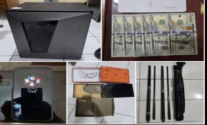 Pelaku ditangkap bersama sejumlah barang bukti, di antaranya satu buah brankas, satu buku rekening BCA, satu unit handphone, dua buah stik biliar, tiga buah kotak, dan enam lembar uang dolar Amerika pecahan 100 dolar.