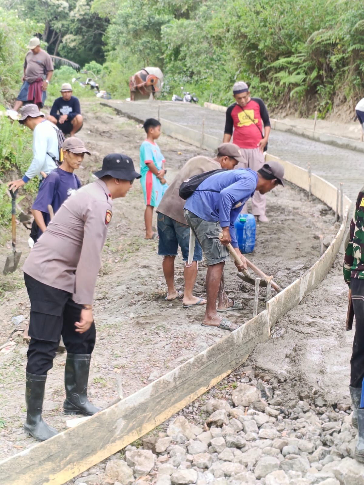 > “Sambil bekerja, kami terus berharap dan berdoa agar masih ada uluran tangan dan dukungan, sehingga target ruas jalan sekitar 4 kilometer ini bisa benar-benar layak diakses warga,” ujar IPTU Kamaluddin.