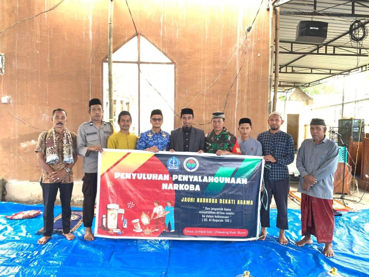 BONE – Ulaweng, Bhabinkamtibmas Desa Jompie, Polsek Ulaweng Polres Bone, menghadiri kegiatan penyuluhan tentang bahaya penyalahgunaan narkoba yang dilaksanakan di Masjid Desa Jompie.