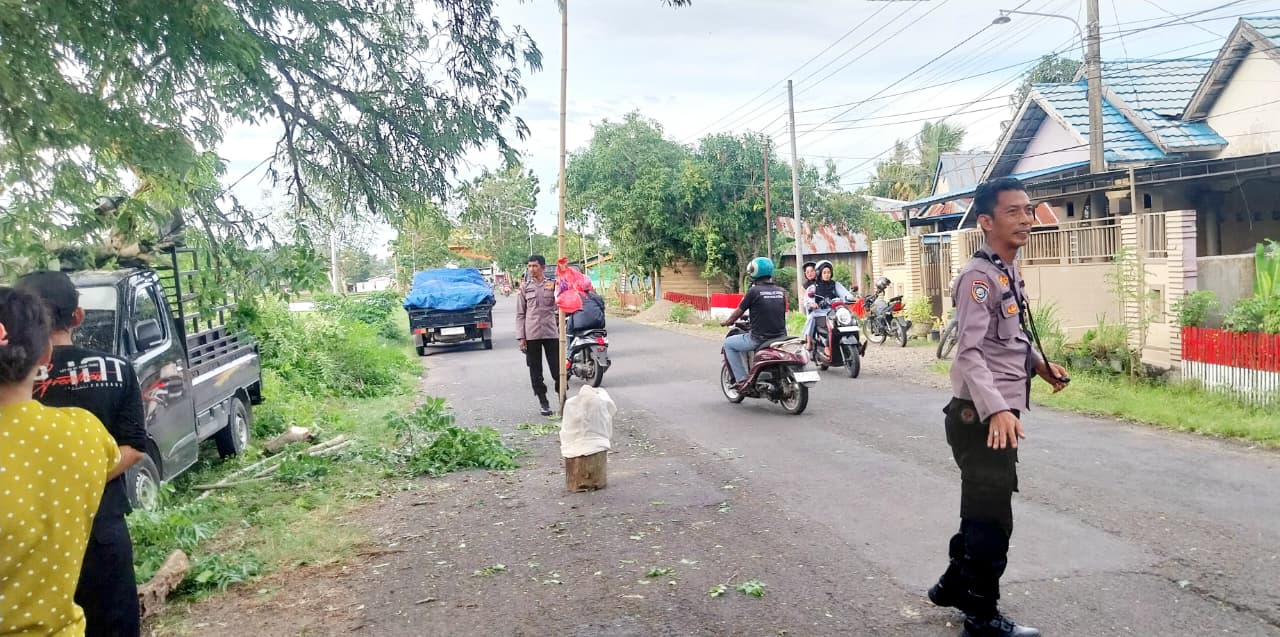 Dalam kegiatan tersebut, Bhabinkamtibmas bersama warga setempat bergotong royong melakukan pembersihan dan evakuasi pohon tumbang dari badan jalan. Selama proses evakuasi berlangsung, arus lalu lintas diatur secara bergantian sehingga kendaraan tetap dapat melintas dengan aman.