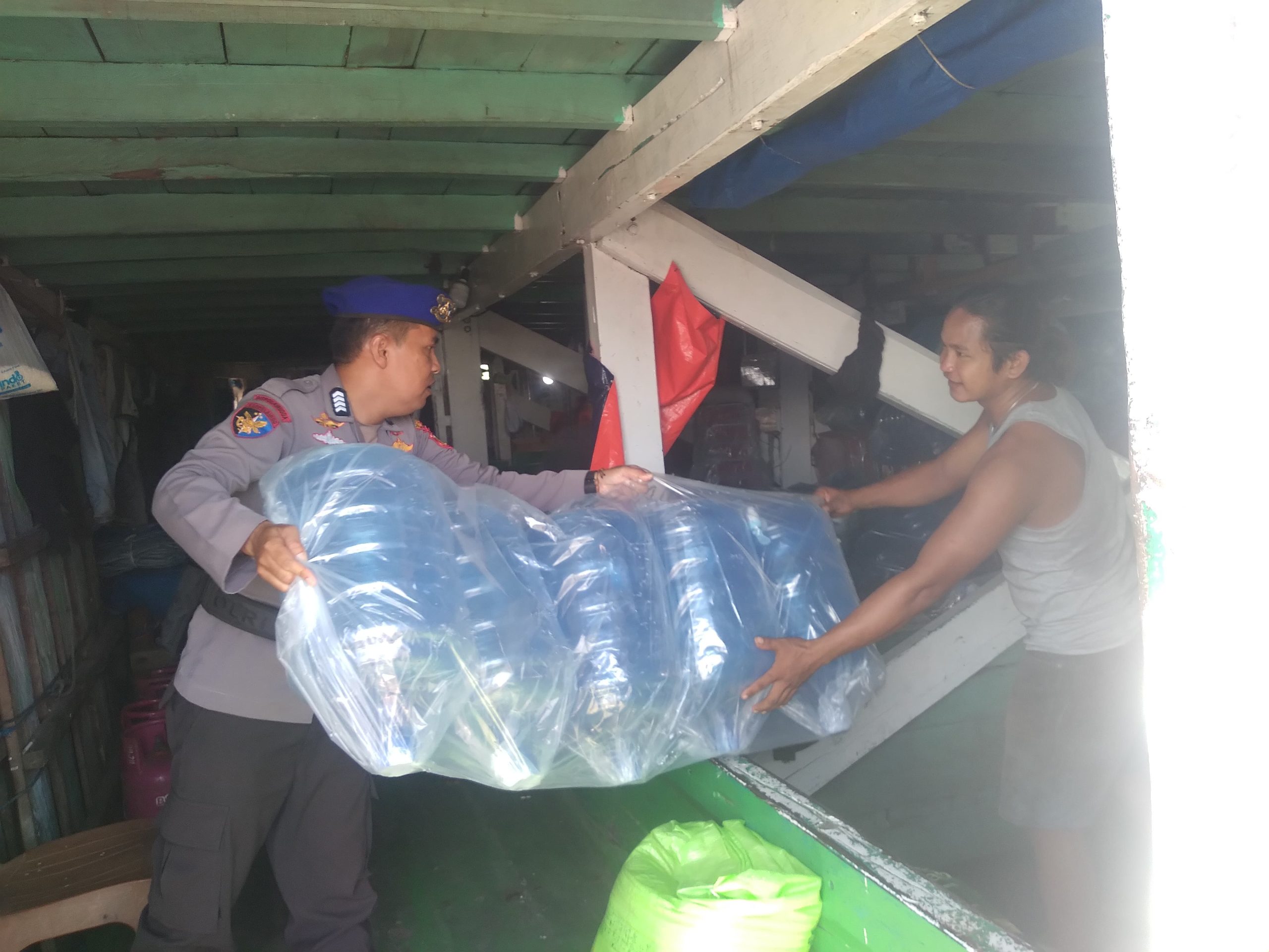 Melalui program Polisi Penolong, personel Satpolairud terlihat membantu mengangkat barang dari mobil untuk dinaikkan keatas kapal.