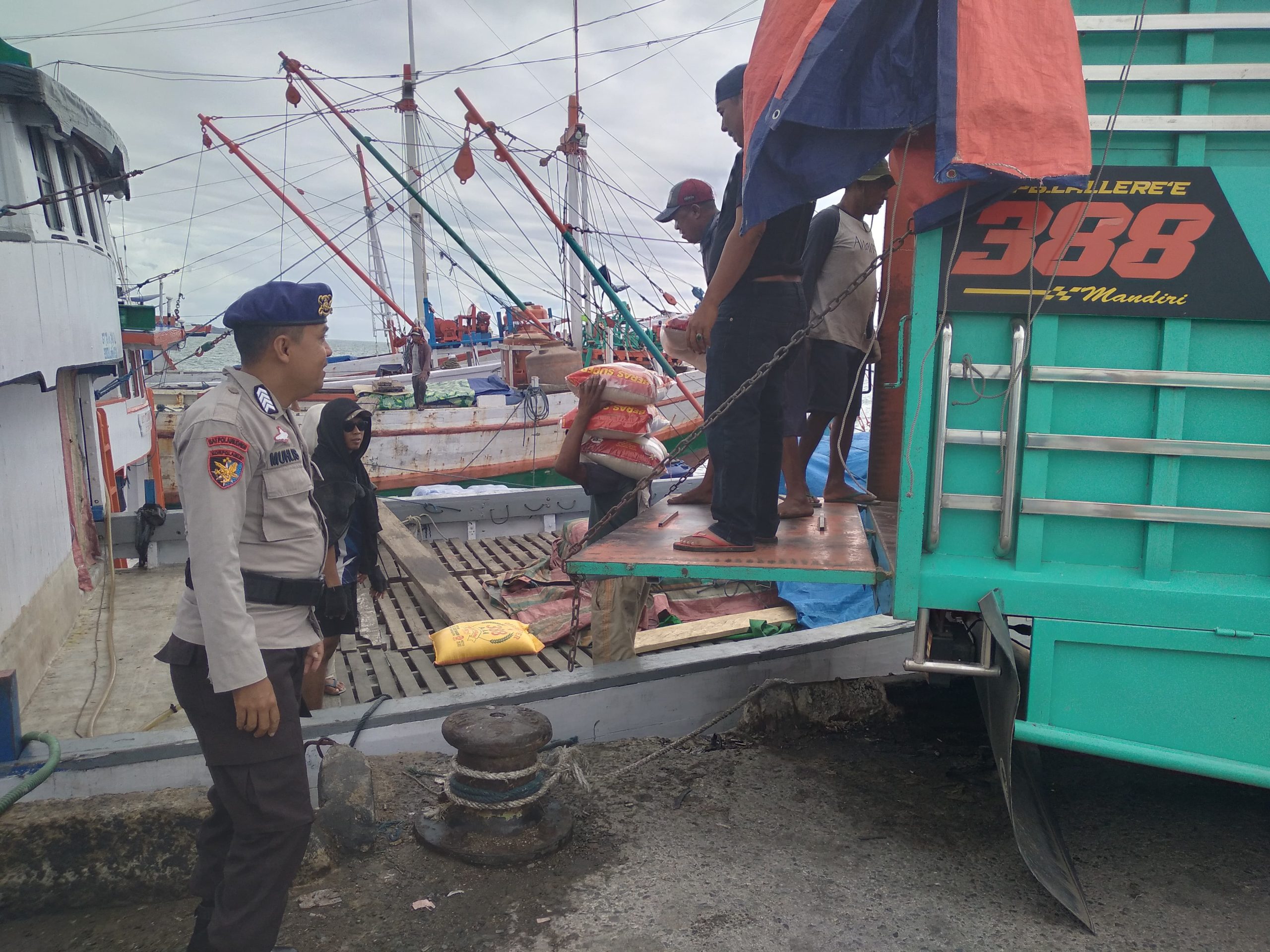 BONE – Bajoe, Petugas Satpolairud Polres Bone melakukan pemantauan aktivitas masyarakat di dermaga pelabuhan rakyat Bajoe yakni bongakar muat barang dari mobil ke kapal yang dilakukan oleh Bripka Muhlis, Senin (26/01/2026) siang.