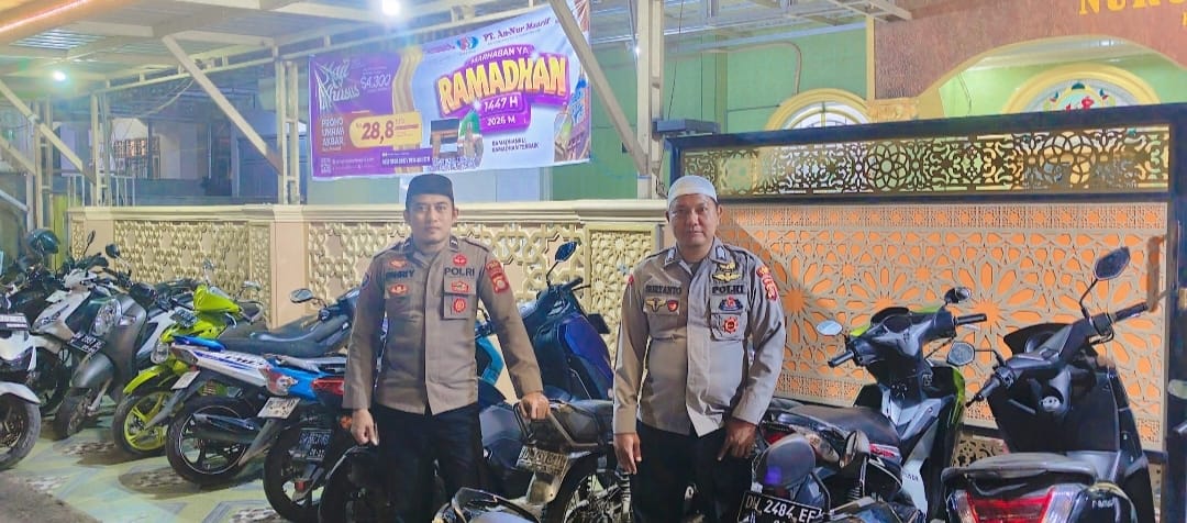 BONE – Bajoe, Guna berikan rasa aman saat pelaksanaan shalat tarawih oleh masyarakat , Personil Polsek Kawasan Pelabuhan Bajoe Polres Bone Bripka Aryanto dan Bripka Fahri Yusdar melaksanakan pengamanan shalat tarawih di masjid. (23/2/26).