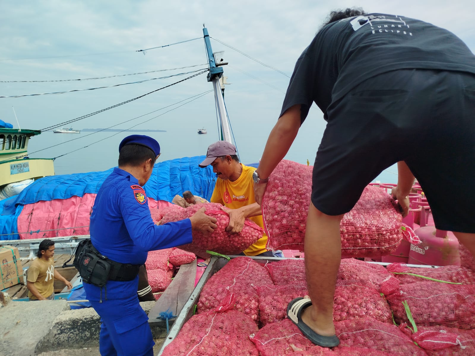 Dalam pelaksanaannya, Aipda Moh. Amir memberikan pelayanan dengan cara membantu menurunkan muatan bawang merah dari mobil ke kapal.