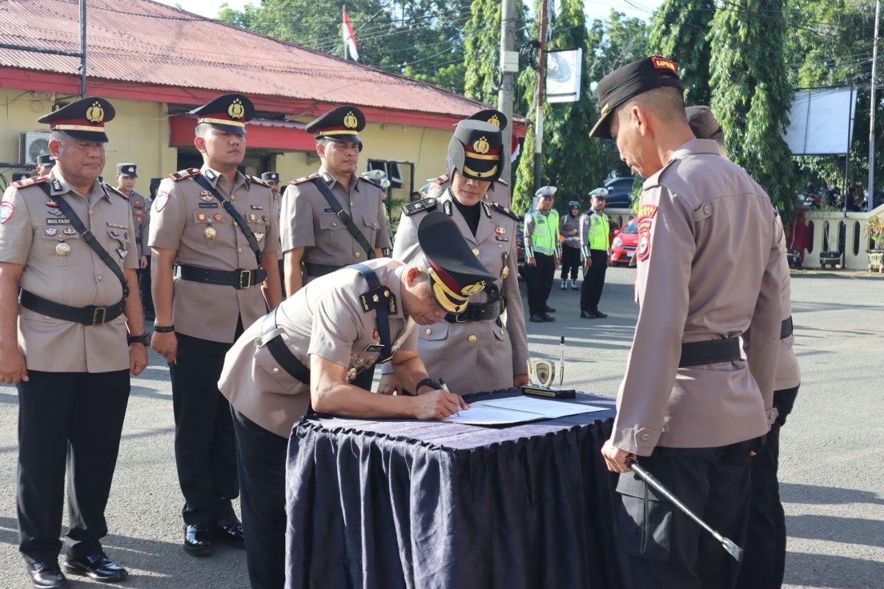BONE – Sejumlah pejabat utama dan Kapolsek jajaran di Polres Bone melaksanakan serah terima jabatan (sertijab) yang dirangkaikan dengan pengambilan sumpah jabatan bagi pejabat baru. Kegiatan tersebut dipimpin langsung oleh Kapolres Bone, AKBP Sugeng Setio Budhi, S.IK., M.Tr.Opsla, bertempat di halaman Mapolres Bone, Jumat (10/4/2026).